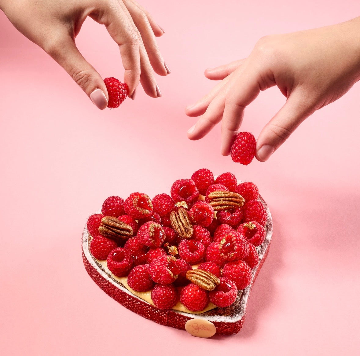 Creme de noz pecãn, cremoso de baunilha e chocolate branco, compota de framboesa e framboesas